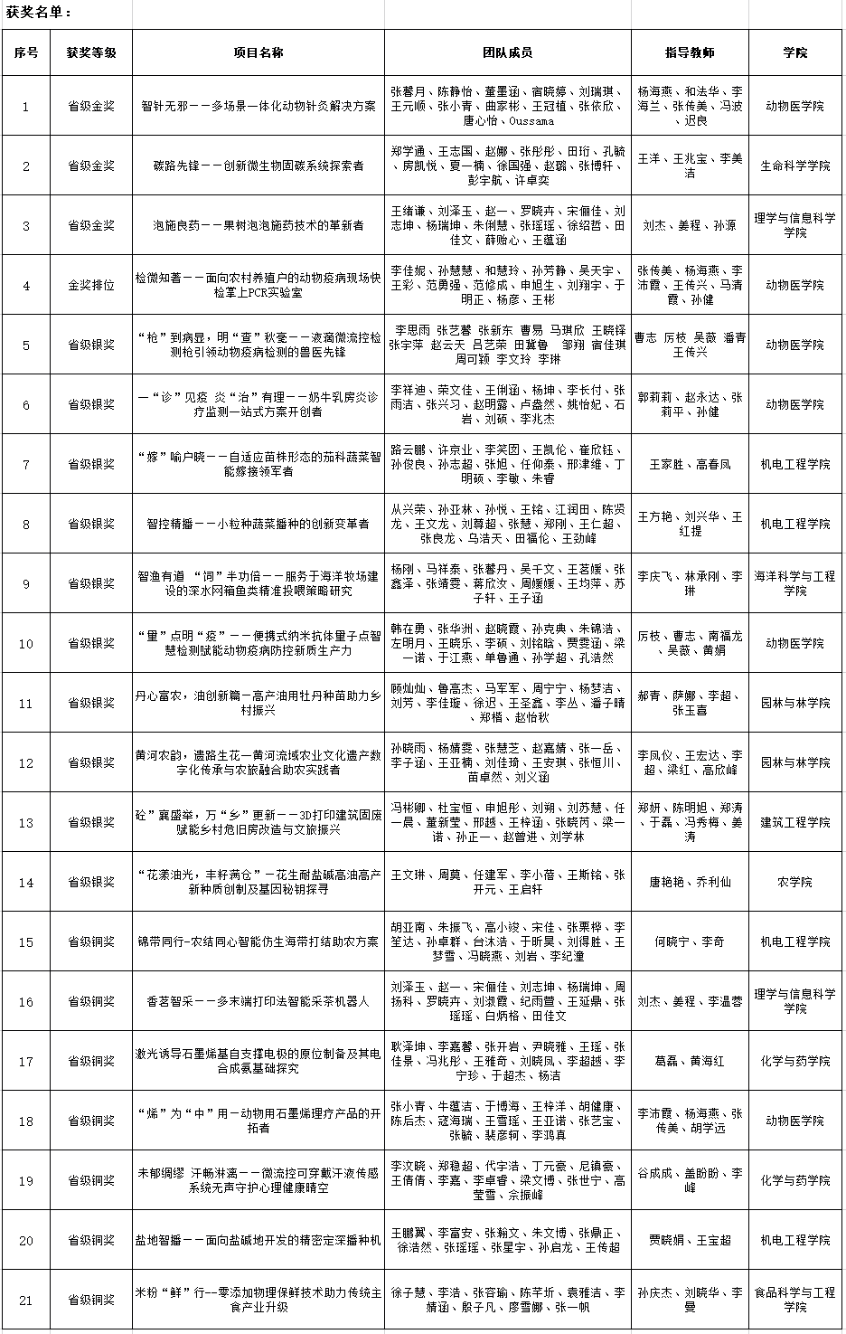动物医学院张传美等老师指导,李佳妮等同学申报的《检微知著——面向农村养殖户的动物疫病现场快检掌上PCR实验室》 针对农村养殖户疫病检测问题受困于实验门槛高的痛点,研发出一款检测成本低、高效便捷且无需连通电源的手持荧光定量PCR仪及其配套全预混冻干检测试剂盒,彻底解决了“设备进不去、技术用不了”的难题;动物医学院杨海燕等老师指导、张馨月等同学申报的《智针无邪——多场景一体化动物针灸解决方案》针对行业面临的治疗方案难确定、穴位难定位、下针深度难精准三大瓶颈,研发出包括智能电针仪和探穴推针笔等辅助医疗设备,让动物针灸治疗标准化、系统化、规范化;生命科学学院王洋等老师指导,郑学通等同学申报的《碳路先锋——创新微生物固碳系统探索者》聚焦“双碳”战略下重点行业的绿色转型,将自主培育的ST01噬碳菌接种于专用光合生物反应器,安置在电力、化工企业烟气处理系统尾端。利用噬碳菌,不仅能“吃掉”二氧化碳,还能转化成番茄红素、气体饲料蛋白等高价值产品。以“变废为宝”的智慧,破解微生物固碳行业“固碳效率低、附加值低、缺乏适配设备”的问题。理学与信息科学学院刘杰等老师指导,王绪谦等同学申报的《泡施良药——果树泡泡施药技术的革新者》聚焦现有施药技术喷洒不均,浪费严重,污染环境等问题,团队研制国内首款果树静电泡泡施药无人机,实现精准施药,提高农药利用率,节省施药成本,促进果农降本增收,助力乡村振兴。