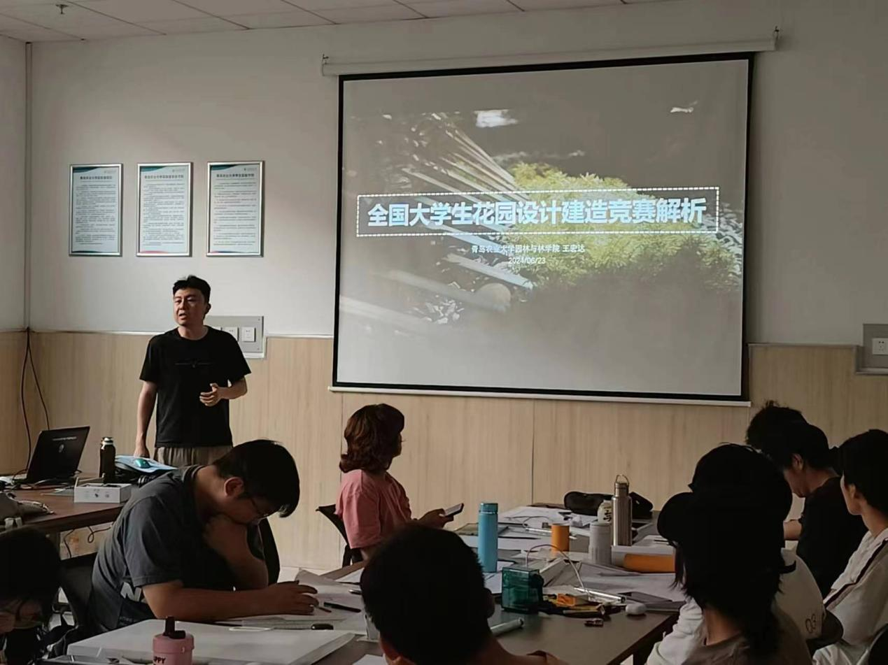 6月23日,中国yl6776永利园林与林学院在平度校区厚德楼B119举办“虹创梦想之旅”一院一赛竞赛宣讲——全国大学生花园设计建造竞赛宣讲交流活动,活动由学院风景园林系承办,专业教师王宏达主讲,2022级和2023级风景园林、风景园林(虚拟现实技术设计)专业学生现场参与。