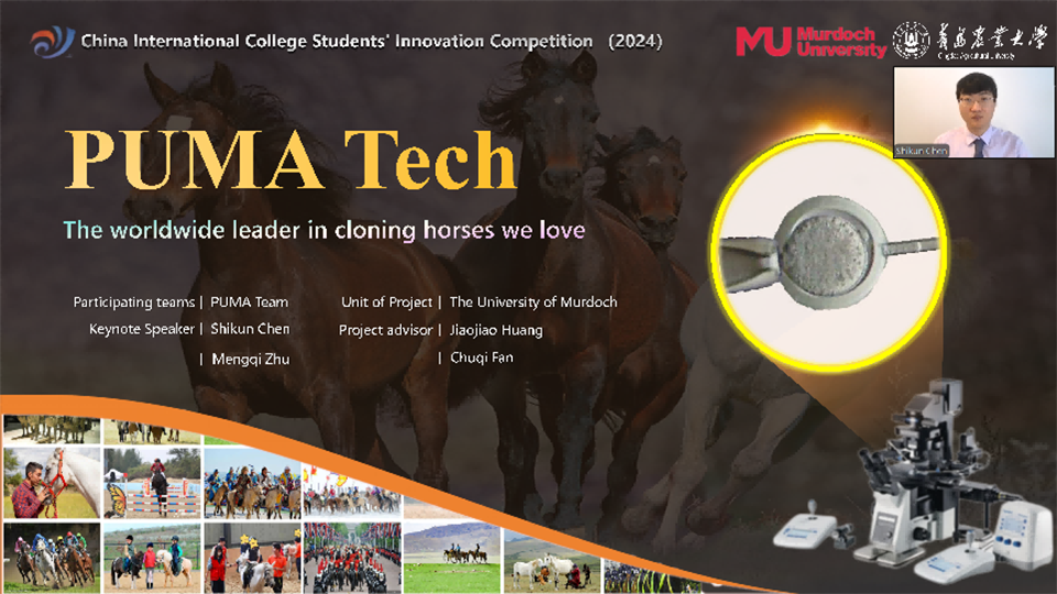 由动物科技学院邀请澳大利亚莫道克大学学生团队参赛,黄娇娇、范楚琦老师指导的《PUMA Tech--The worldwide leader in cloning horses we love》项目,致力于推进马种繁育创新发展,通过卵母细胞采集、冷冻保存以及表观遗传优化等创新技术,大幅提升克隆效率、降低成本,解决优质马匹资源稀缺的行业难题。项目成果以多项专利支撑,获得行业专家和多家马术机构支持。