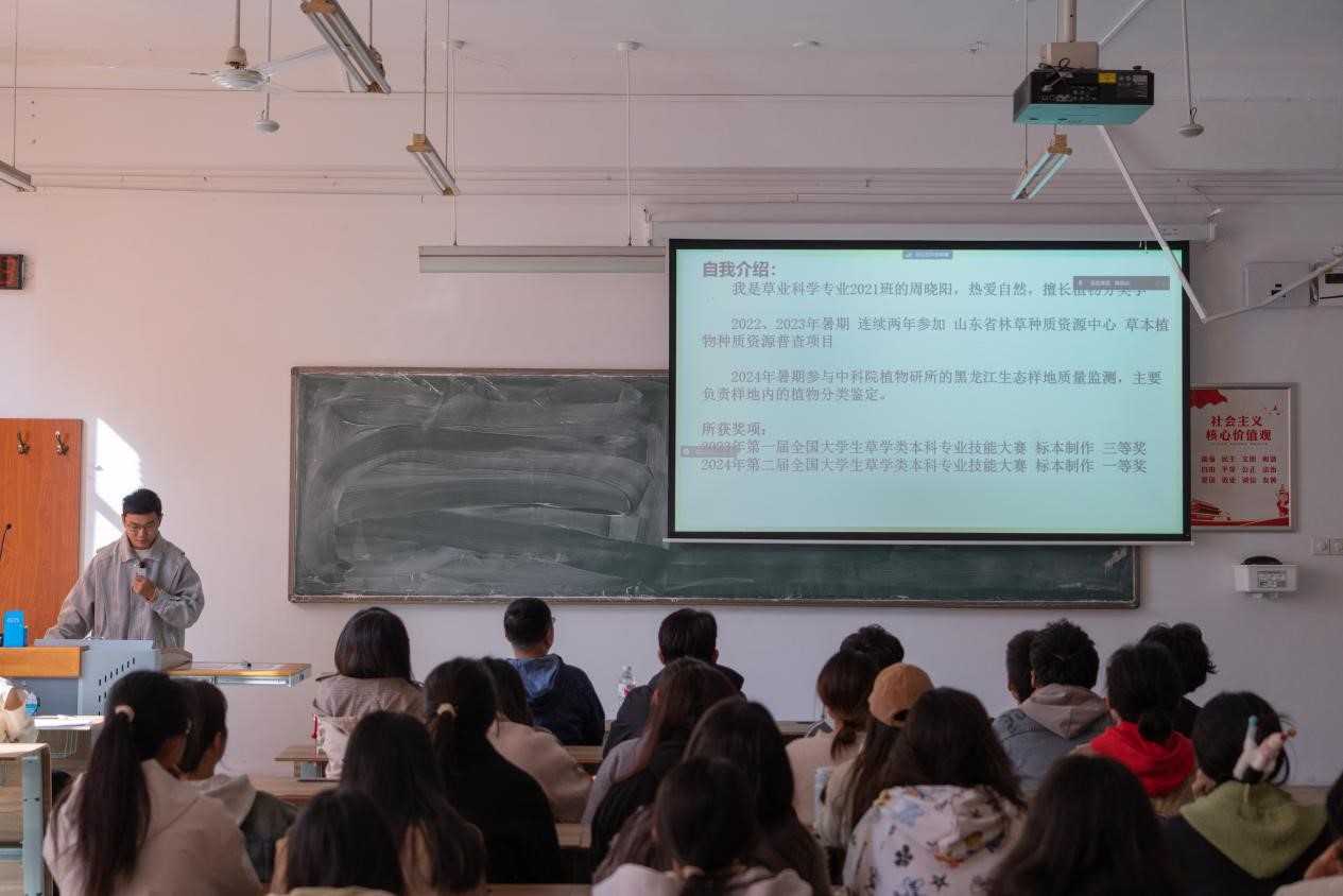 草业(创新)2101班周晓阳分享了他在全国大学生草学类本科专业技能大赛中获得国家级一等奖的参赛经验。他介绍了植物标本赛道的竞赛规则,强调了参赛作品主题的选择的重要性,讲解了参赛过程中的注意事项,传授了标本制作的保绿技术和塑化技术的实用技巧,为在场的同学们参加高级别专业竞赛提供了宝贵的经验。